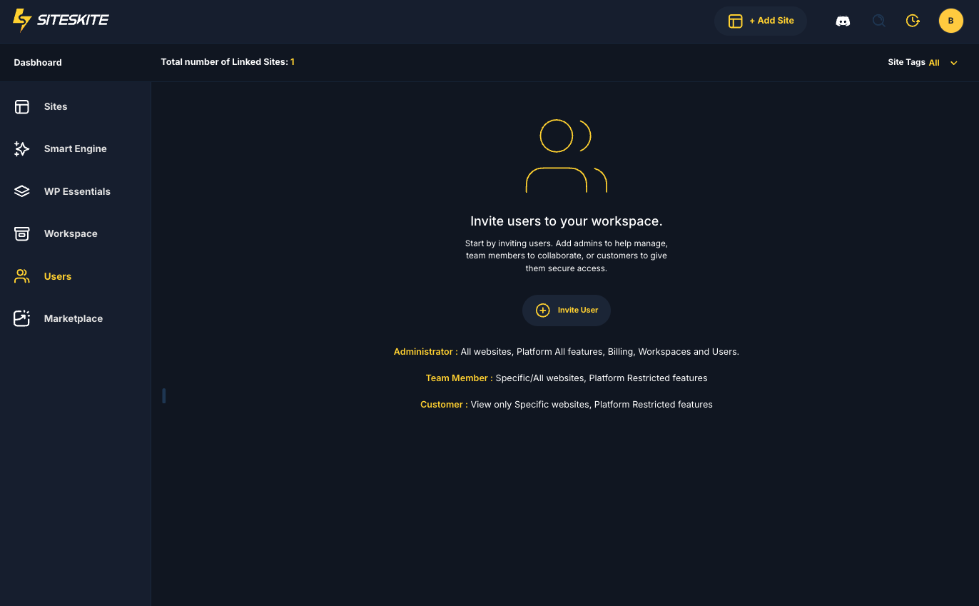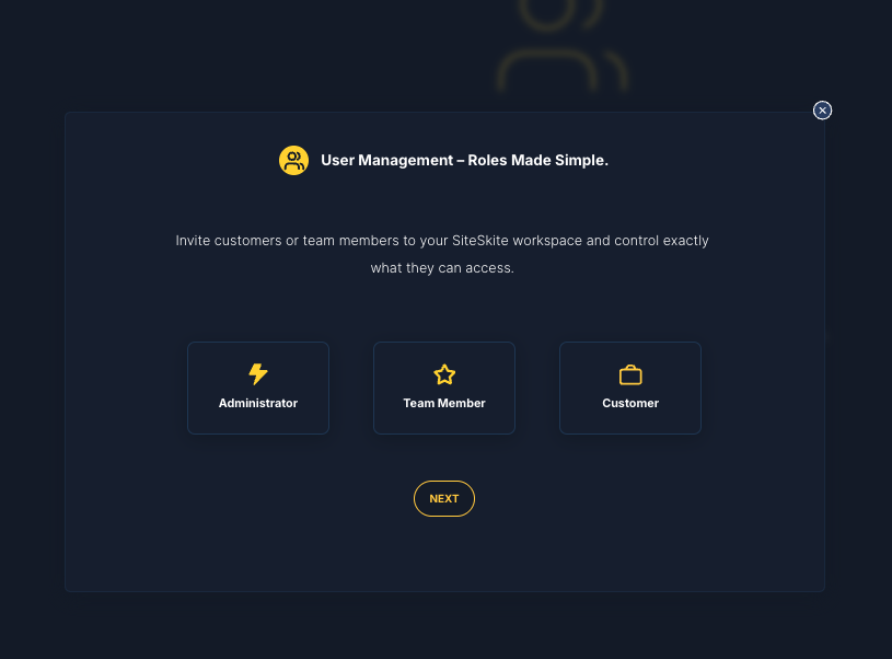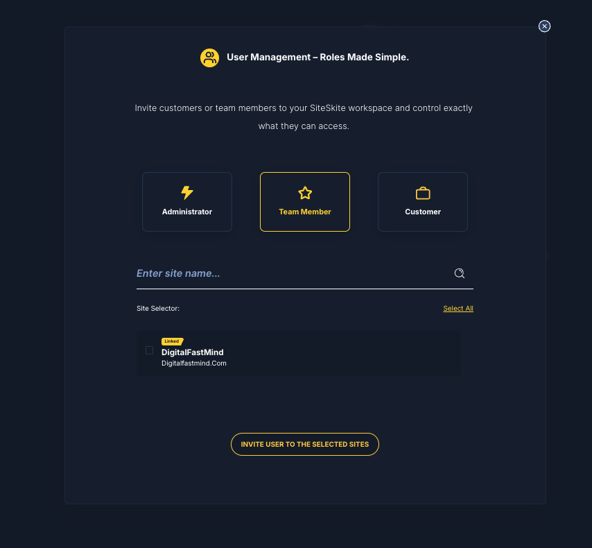SiteSkite lets you collaborate by inviting as team members, customers, and administrators with different levels of access. This helps agencies, freelancers, and businesses manage websites together while keeping control over roles and permissions.