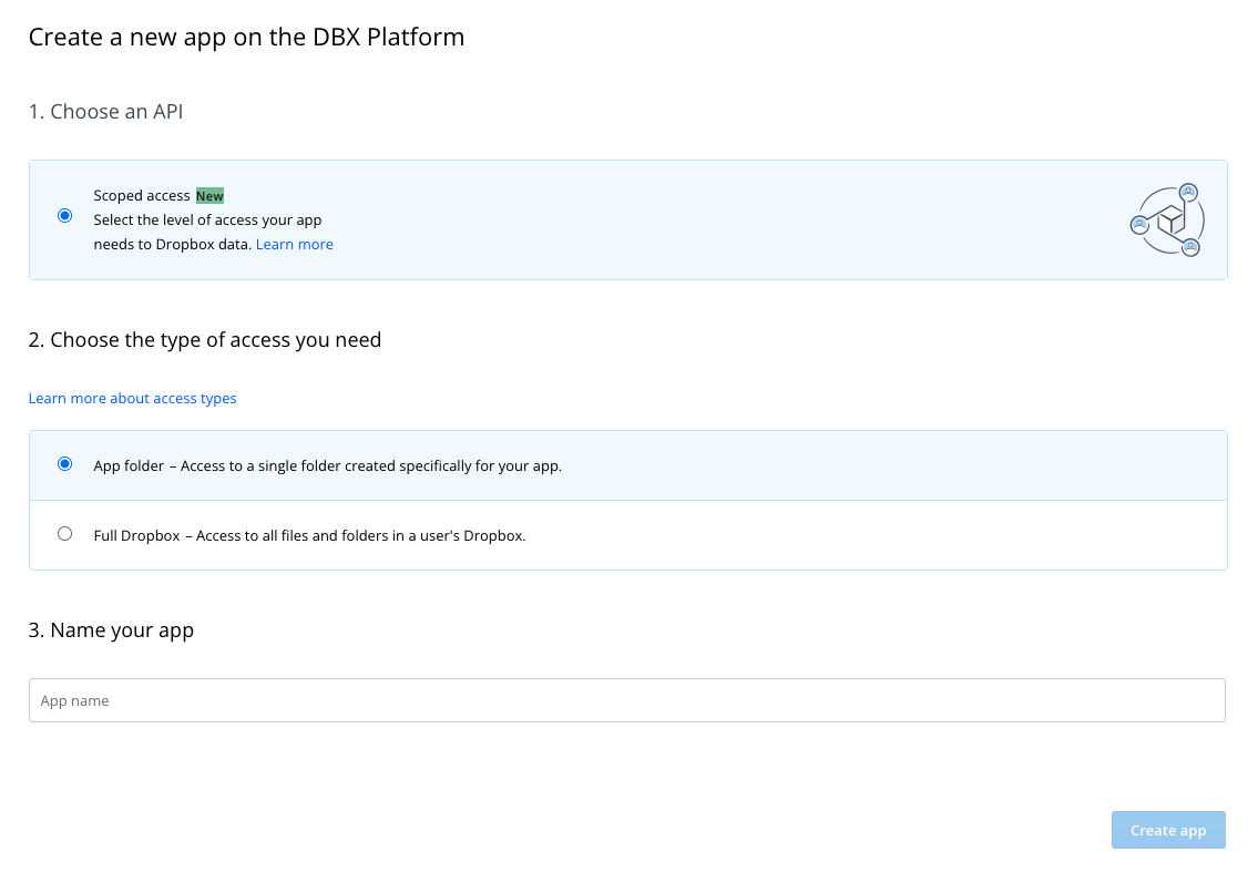 Permission Type → Full Dropbox or App Folder (choose depending on your preference).