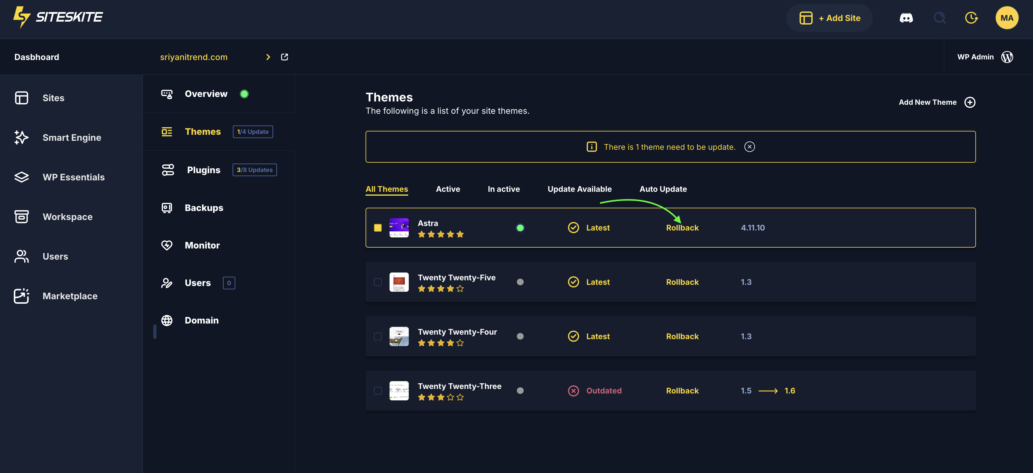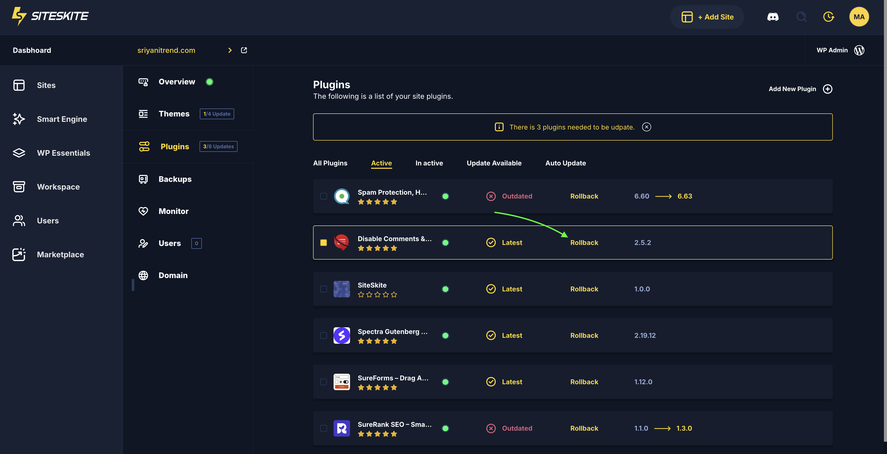 Sometimes an update may cause your site to break or conflict with other plugins/themes. SiteSkite provides a built-in Rollback feature so you can restore a plugin or theme to a previous stable version without logging into WordPress.