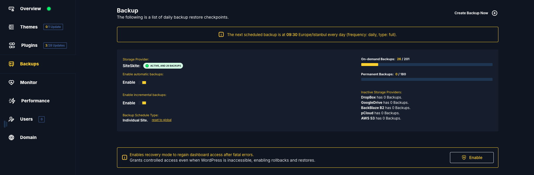 The Site Recovery Mode feature in SiteSkite is designed to help you regain control of your WordPress website when it becomes inaccessible due to fatal errors, plugin conflicts, theme issues, or code problems.