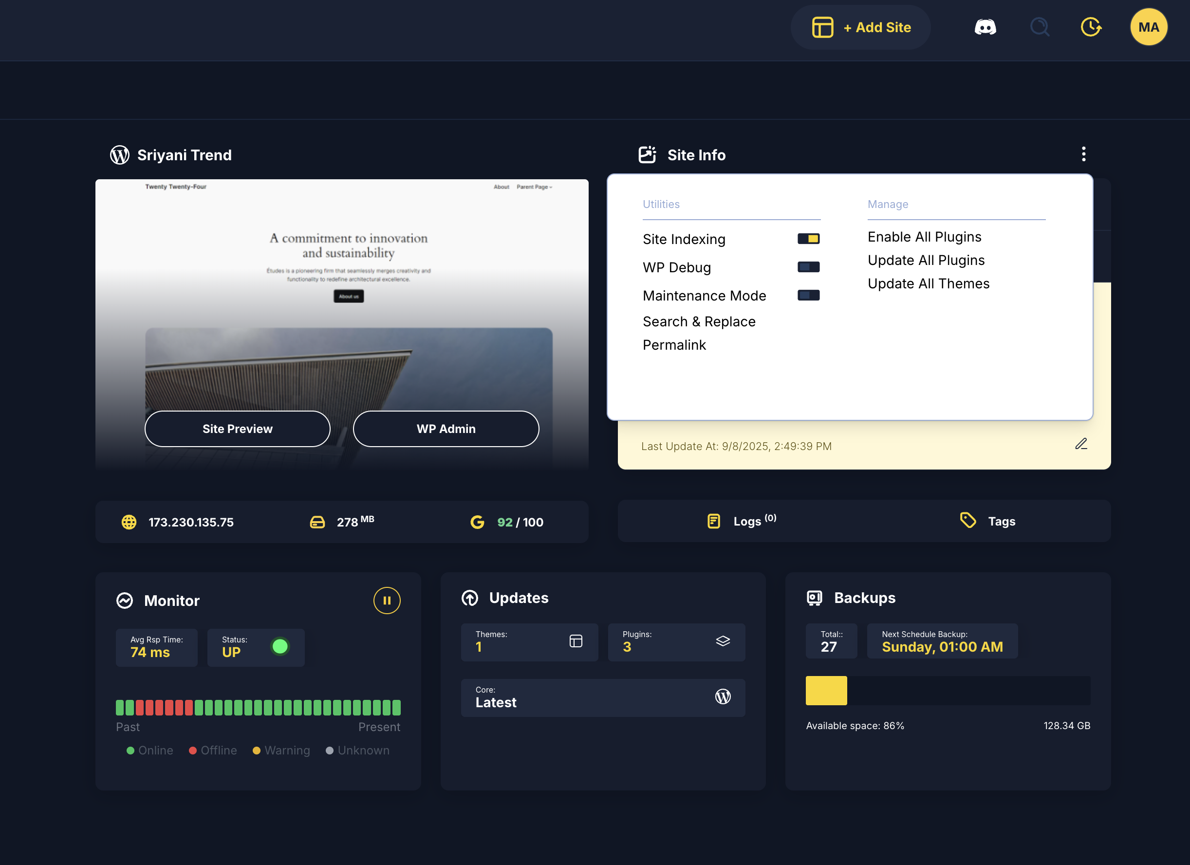 Add internal, non-public notes tied to the site (for example: “Client requested plugin X removed” or “Staging updated on 2025-09-07”). Notes are visible to your team/account users and help keep site-specific context in one place.