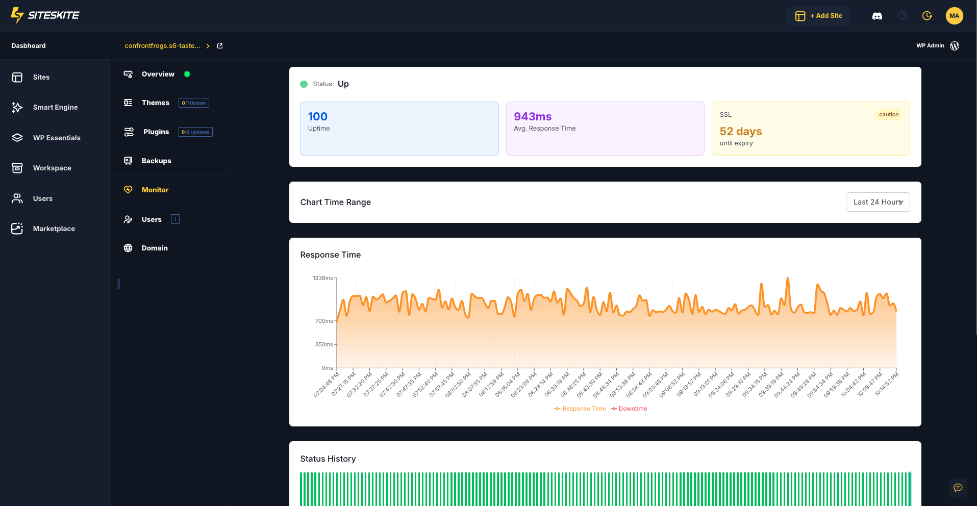 SiteSkite Monitor tracks the online/offline status of each linked website by leveraging REST API checks and HTTP status monitoring.